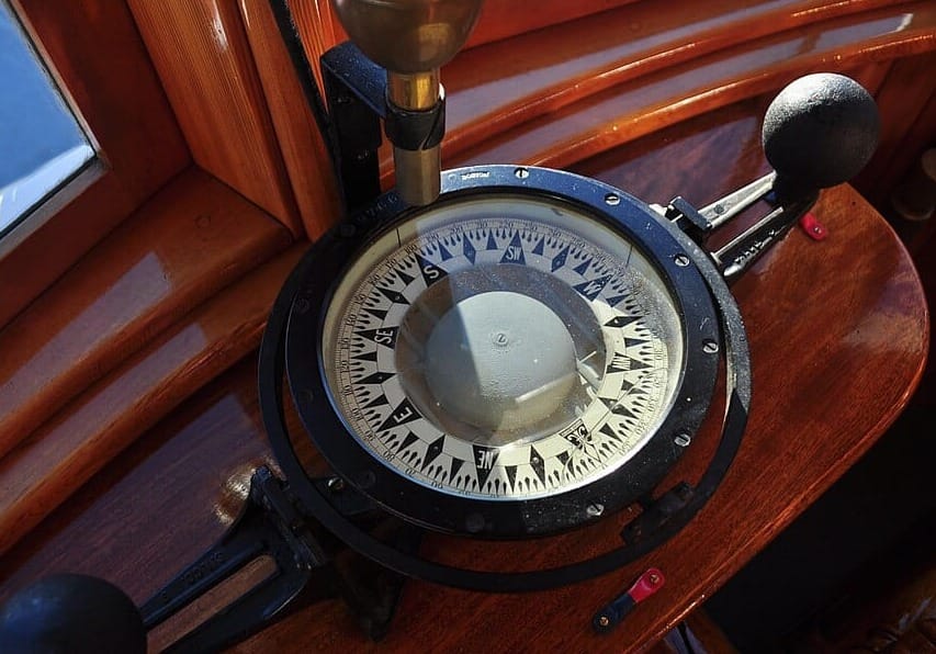 A deviation card near the helm helps correct for vessel-specific compass errors.